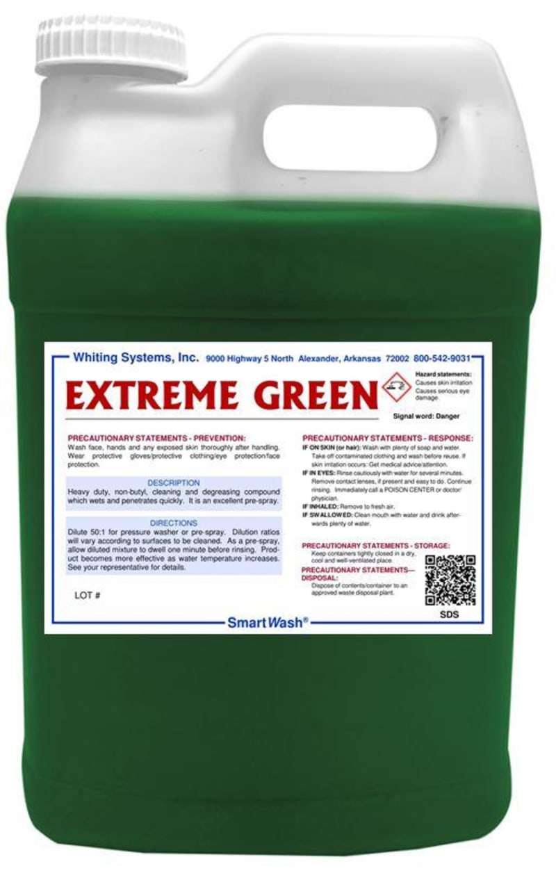 SmartWash Extreme Green is an easy-to-use fast acting degreaser that quickly cuts through oil and grease. It rinses off easily, making it perfect for use as a pre-spray or with pressure washers to clean engines, shop floors, concrete sidewalks, brick and vinyl siding.